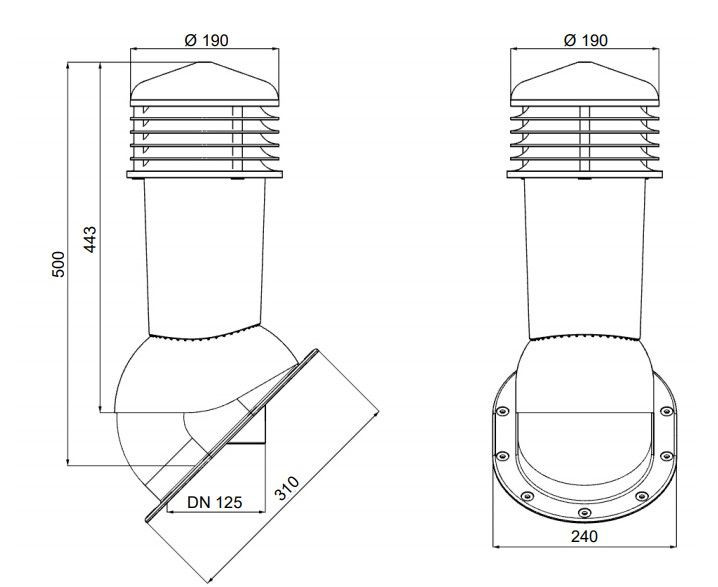 - Комплект вентиляционного выхода с отводом конденсата для кровли из гибкой битумной черепицы (готовой). В конструкции вентвыхода предусмотрены специальные каналы для отвода конденсата на кровельное покрытие.