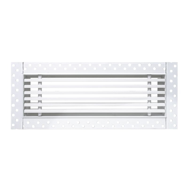 Данная решетка подходит для монтажа на любую поверхность под финишную отделку. Рамка и экран изготовлены из алюминия, опора экрана - из оцинкованной стали. Рама оснащена «полкой» 1,9 мм и рифлеными краями для большей адгезии финишного материала – шпатлевки, цемента. Решетка имеет съемную центральную часть с фиксированным углом наклона ламелей 15°. Она крепится к корпусу прочными металлическими тросиками, легко снимается для очистки и удобного обслуживания.