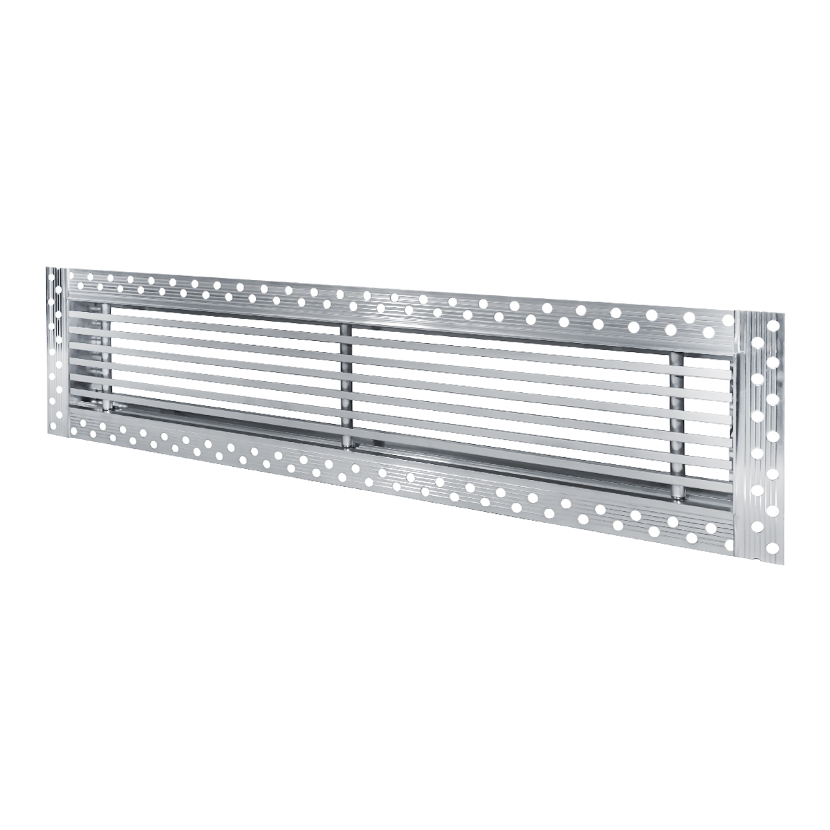Данная решетка подходит для монтажа на любую поверхность под финишную отделку. Рамка и экран изготовлены из алюминия, опора экрана - из оцинкованной стали. Рама оснащена «полкой» 1,9 мм и рифлеными краями для большей адгезии финишного материала – шпатлевки, цемента. Решетка имеет съемную центральную часть с фиксированным углом наклона ламелей 15°. Она крепится к корпусу прочными металлическими тросиками, легко снимается для очистки и удобного обслуживания.