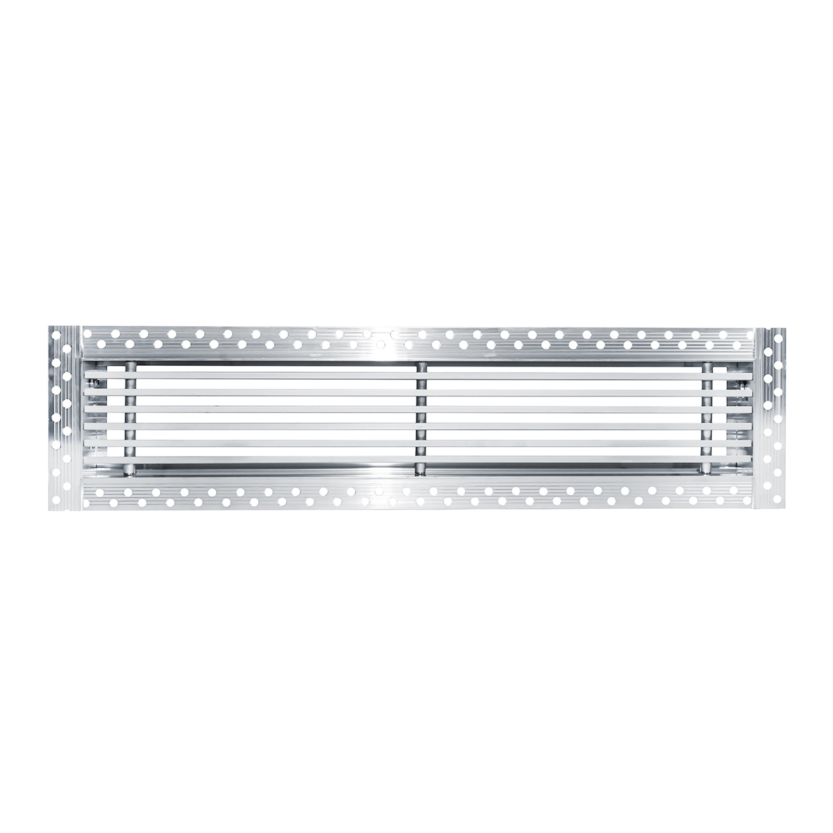 Данная решетка подходит для монтажа на любую поверхность под финишную отделку. Рамка и экран изготовлены из алюминия, опора экрана - из оцинкованной стали. Рама оснащена «полкой» 1,9 мм и рифлеными краями для большей адгезии финишного материала – шпатлевки, цемента. Решетка имеет съемную центральную часть с фиксированным углом наклона ламелей 15°. Она крепится к корпусу прочными металлическими тросиками, легко снимается для очистки и удобного обслуживания.