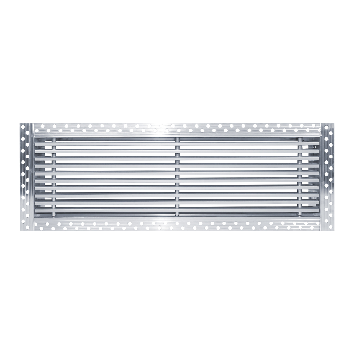 Данная решетка подходит для монтажа на любую поверхность под финишную отделку. Рамка и экран изготовлены из алюминия, опора экрана - из оцинкованной стали. Рама оснащена «полкой» 1,9 мм и рифлеными краями для большей адгезии финишного материала – шпатлевки, цемента. Решетка имеет съемную центральную часть с фиксированным углом наклона ламелей 15°. Она крепится к корпусу прочными металлическими тросиками, легко снимается для очистки и удобного обслуживания.