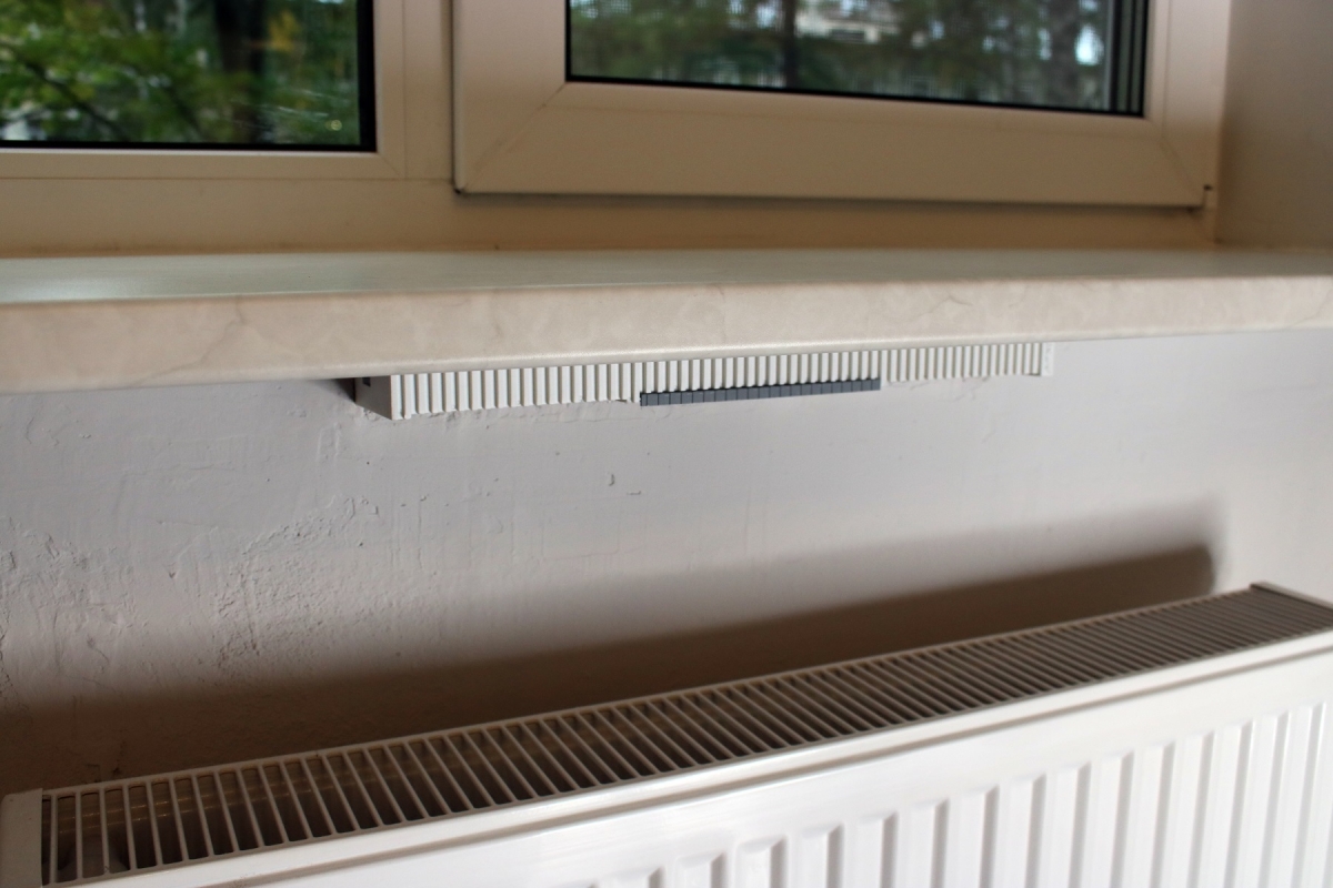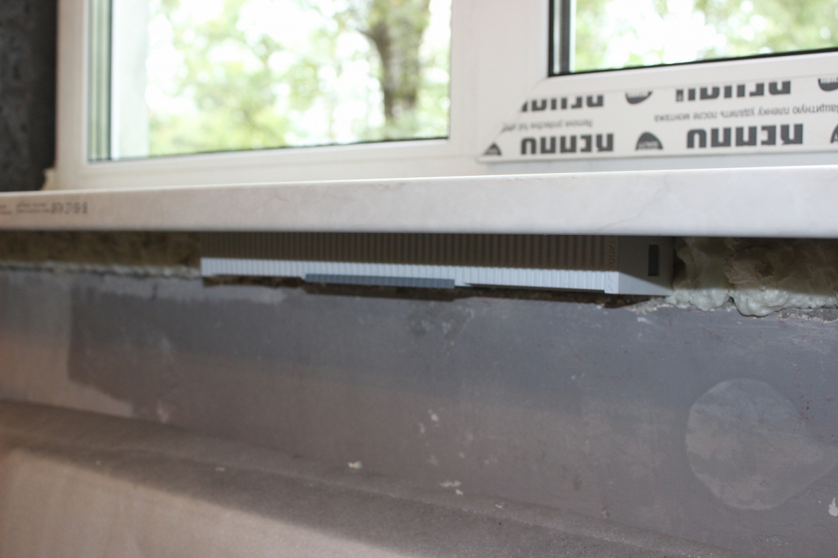 Оголовок клапана (высота 51 мм) с G3 фильтром будет находиться и крепиться под подоконником над радиатором с выходом воздуха на радиатор отопления, воздуховоды - плоские, будут монтироваться в нишу между оконным профилем и оконным стеновым проемом (монтажнику окна необходимо предусматривать там зазор 50мм), далее выходить под отлив и закрываться им.