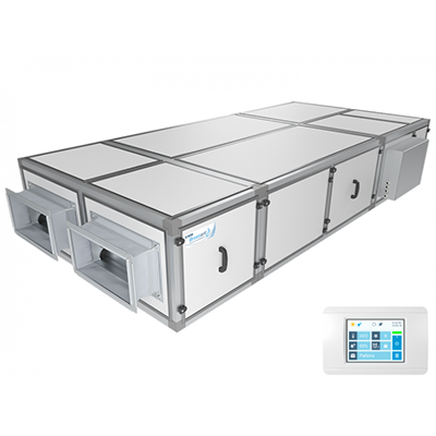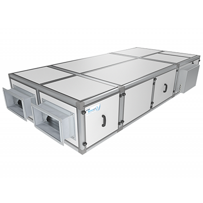 - Приточно-вытяжная установка подвесного типа с пластинчатым рекуператором, системой защиты от замерзания, эффективный рабочий диапазон до -35°С) и электрическим нагревателем.