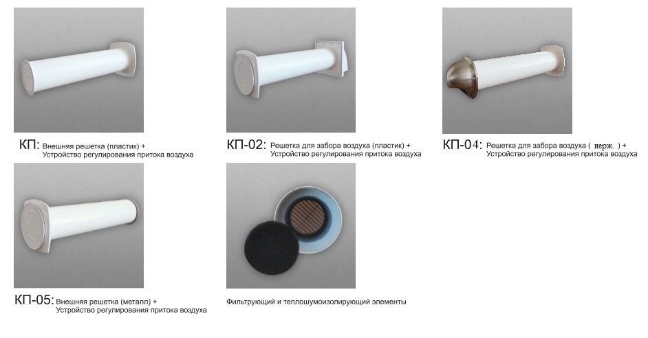 Комплектация - Решетка для забора воздуха (пластик), Устройство регулирования притока воздуха, фильтрующие и теплошумоизолирующие элементы