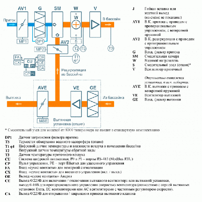 Приточно-вытяжная установка Aqua Pool Mix комплектуется вентиляторами EBMPapst серии EC, системой автоматики JetLogic с цветным сенсорным пультом управления и всеми необходимыми датчиками, а также камерой смешения, позволяющей снижать влажность в помещении бассейна дозированной подачей сухого наружного воздуха. Эта серия отличается низкой стоимостью и рекомендуется для регионов с умеренным климатом.