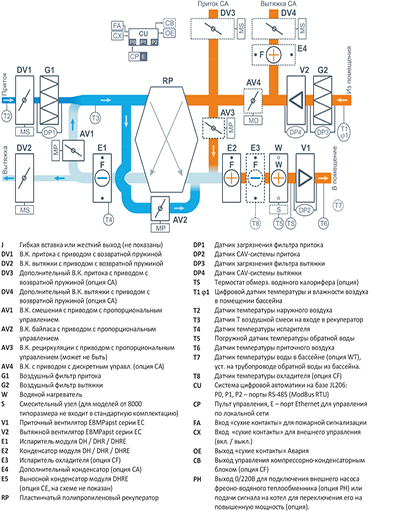 - Возможные опции PH нагрев воды в бассейне WT температура воздуха по температуре воды PW дополнительный водяной калорифер CF дополнительный охладитель и управление ККБ CH переключение тепло-холод CE выносной конденсатор и переключение тепло-холод DS диспетчеризация.